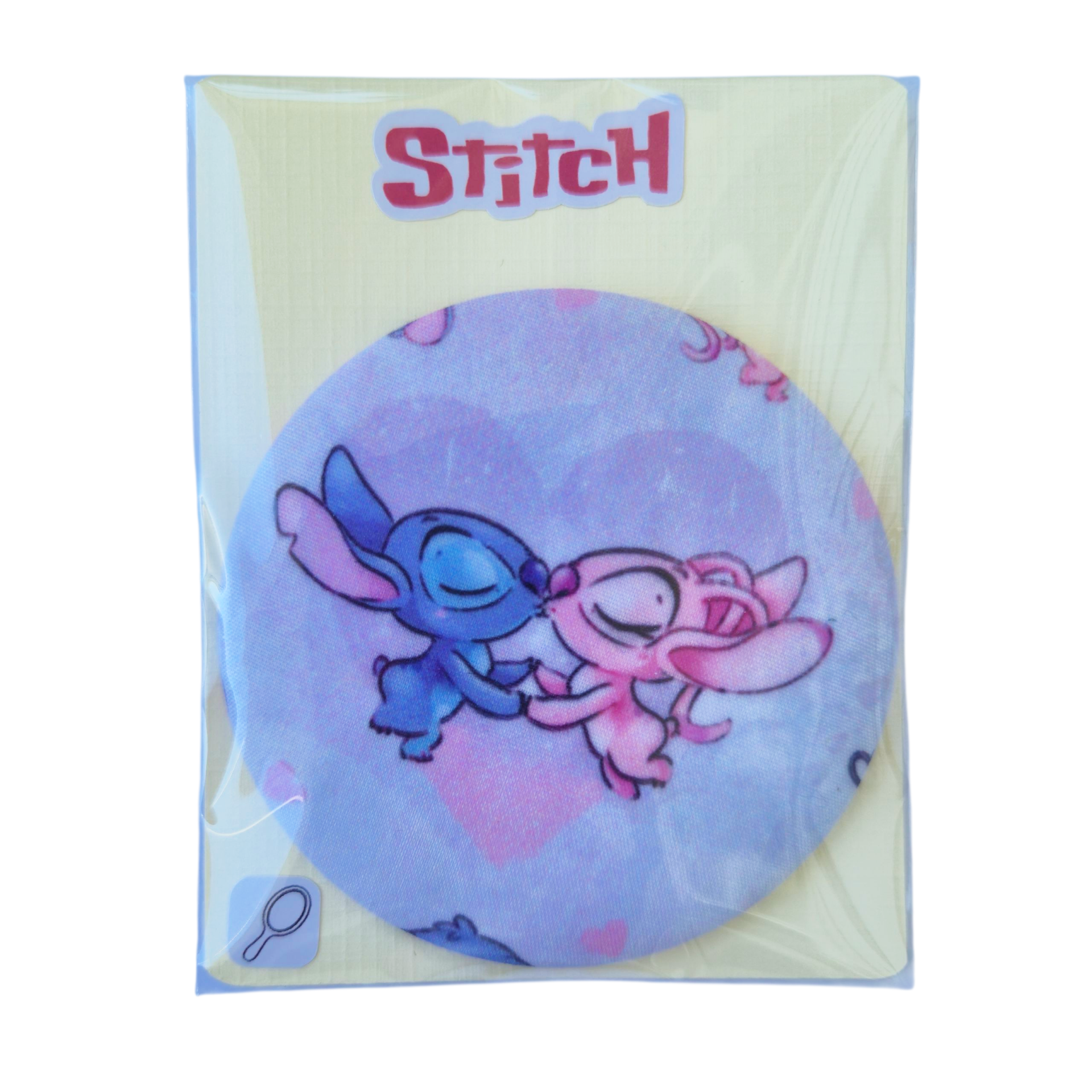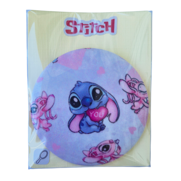 Super-origineel, deze met stof beklede spiegel-buttons van Stitch. Iedere button is 7,5 cm doorsnee en is mooi verpakt.