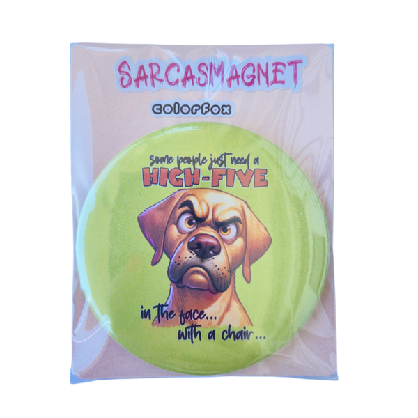 Voor iedereen die van een beetje donkere, sarcastische humor houdt! De 'sarcasmagnet' magneet-button is er in verschillende designs. Iedere button is 7,5 cm doorsnee en is mooi verpakt.